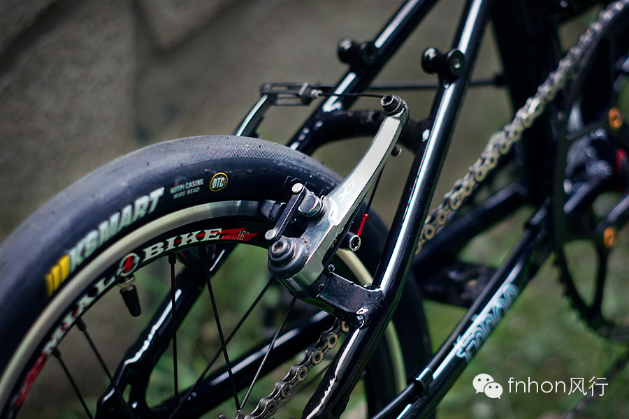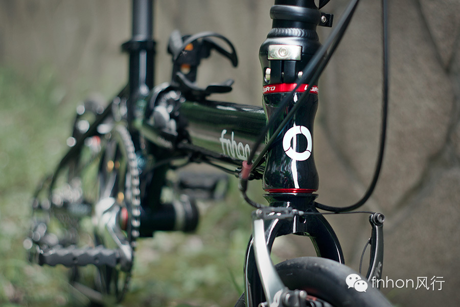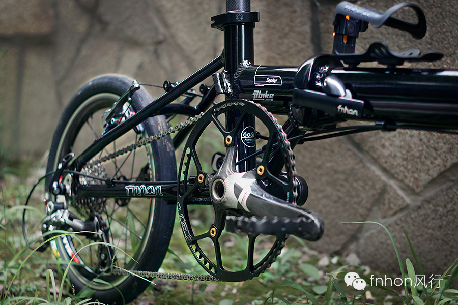 fnhon Zephyr车架 / fnhon 40cm双钉头管 / litepro 碗组 / litepro 碳纤维把横 / litepro 碳纤维坐管 / litepro 56t 光光盘 / avid fr7 刹把 / Shimano xtr960 平推v刹 / Shimano 5700 10速飞轮 / KMC 10速 全镂空链条 / GXP中轴 / SRAM force 碳纤维曲柄 / SRAM force 10速后拨 / SRAM XO 10速指拨 / 蜘蛛坐包 / 米洛星芒16寸轮组 (dt辐条 dt辐条帽) / 建大16 x 1.35 外胎 / xxf海绵把套 / 嘉威L3线管,特富龙内线 / (好多奢侈的配件啊,你妈妈知道你花了多少钱DIY的这台折叠车么?)